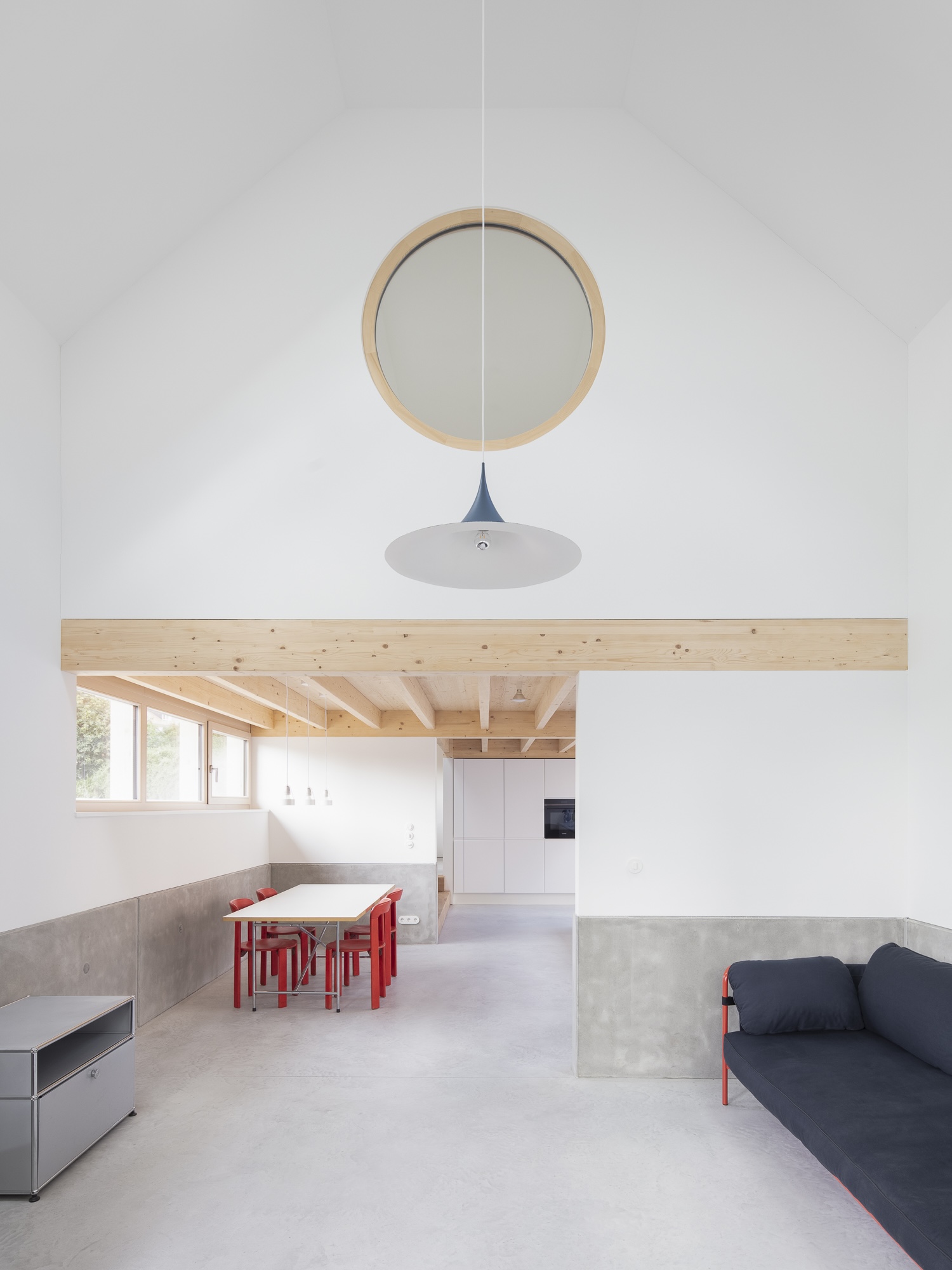Material choices reinforce structural legibility. Timber frame construction with recycled insulation and wood fiber boards forms the building envelope, an approach that prioritizes both environmental responsibility and construction efficiency. The exposed concrete base anchors the structure to its site, while polished screed flooring throughout provides a continuous, reflective surface that amplifies available light. Timber windows fitted with external protective frames acknowledge the building’s exposure to railway activity and cemetery proximity, while uniformly blue-painted steel elements punctuate neutral surfaces with moments of precise color. The handcrafted spiral staircase exemplifies this approach, transforming a functional necessity into a sculptural gesture that reveals the project’s commitment to careful fabrication.