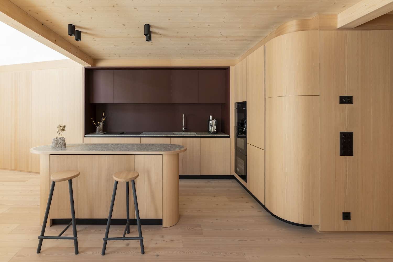 Park’s interior design draws from Carlo Mollino and Edoardo Gellner’s Alpine architectural precedents, reinterpreting their formal languages through materials, colors, and geometries that establish dialogue with surrounding mountain context. Wood detailing creates soft edge conditions that guide transitions between rooms, avoiding the spatial rigidity sometimes associated with Alpine modernism while maintaining essential character.