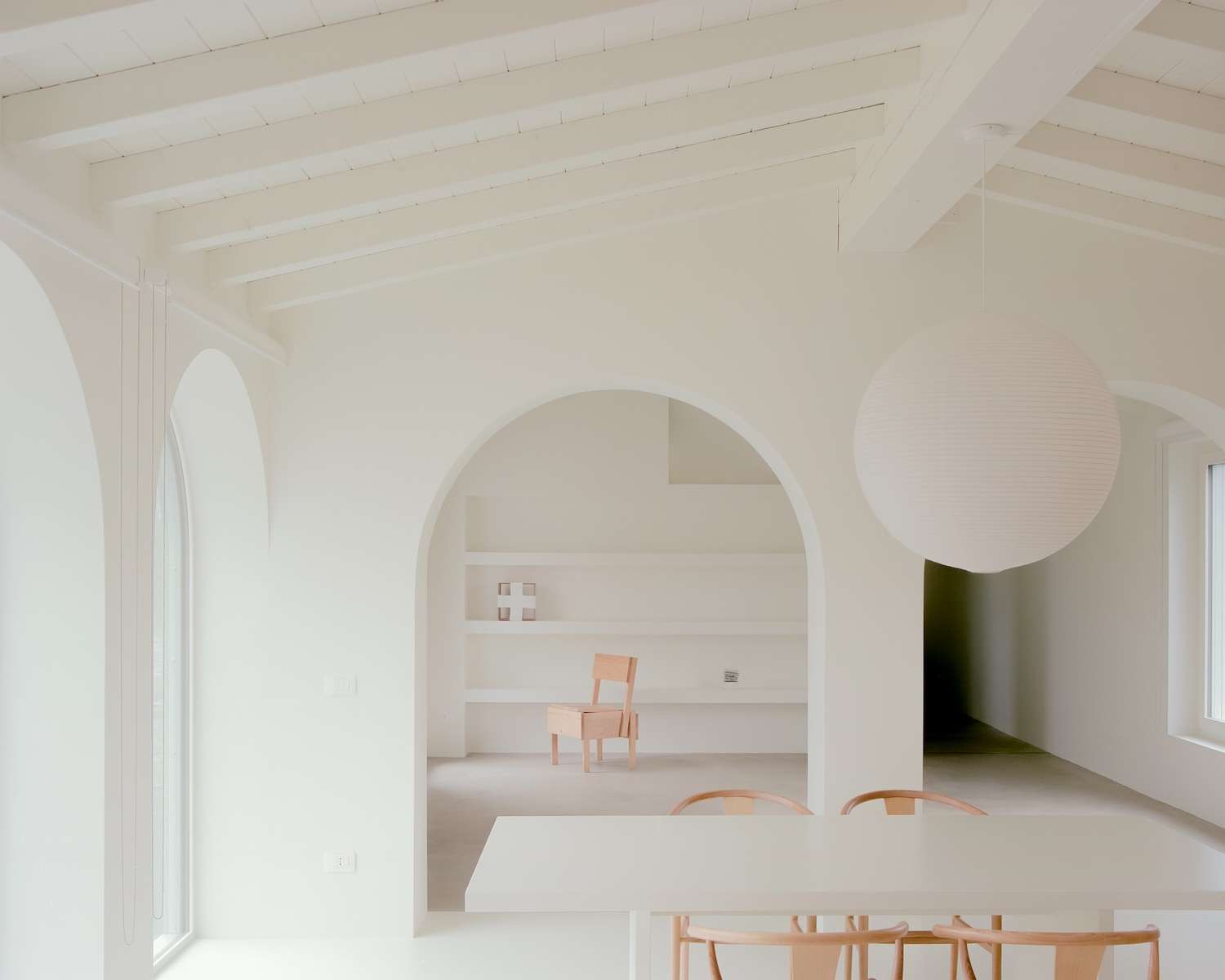 The contrast between exterior and interior is the project’s central architectural gesture. Where the outside presents a surface that is coarse and unyielding, the interior opens into warmth and spatial generosity. This tension between a defensive shell and a nurturing core has deep roots in domestic architecture – from the Roman domus, where blank perimeter walls gave way to richly articulated courtyards, to the introverted houses of North African medinas. Casa GA operates within this same tradition of concealment and revelation, using the severity of its cladding as a threshold condition that heightens the experience of arrival into the living spaces beyond.