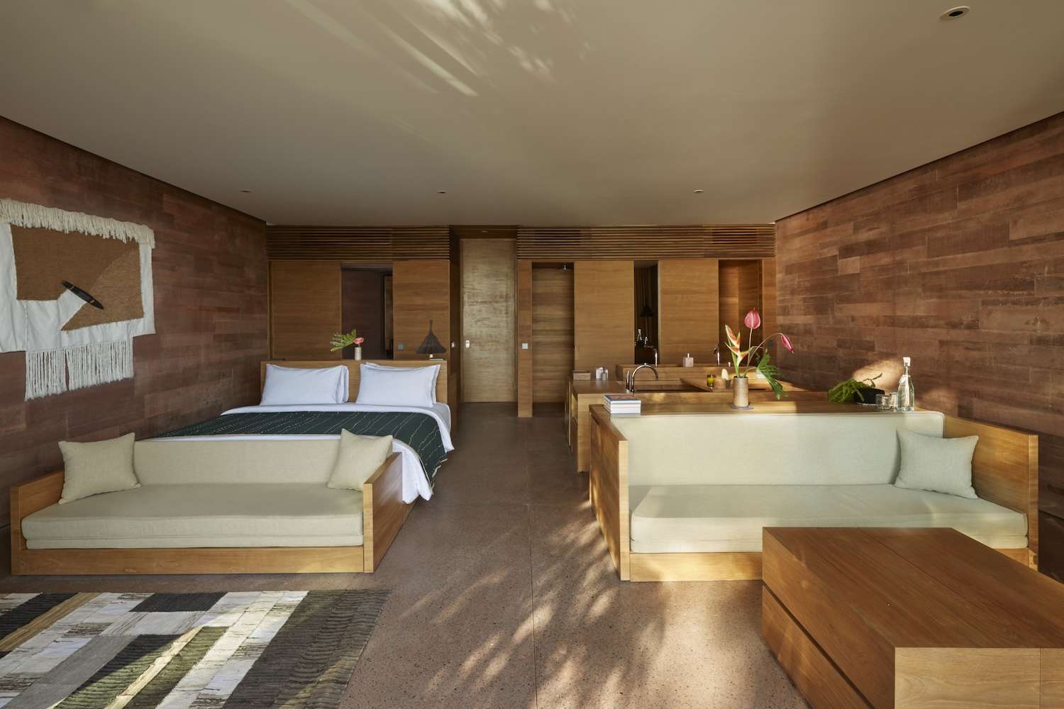 OMA fitted the building throughout with materials sourced from small-scale makers across the island: handmade ceramics, woven textiles, and basketry from local craftspeople. This material density sits in deliberate contrast to the structural clarity of the plan – locally rooted surfaces held within a precise architectural order. OMA organised the programme around a central courtyard – the spatial and social core – which opens toward an amphitheatre for live performance before giving way to the pool and the beach. Each step in that sequence loosens the boundary between interior focus and outdoor exposure.