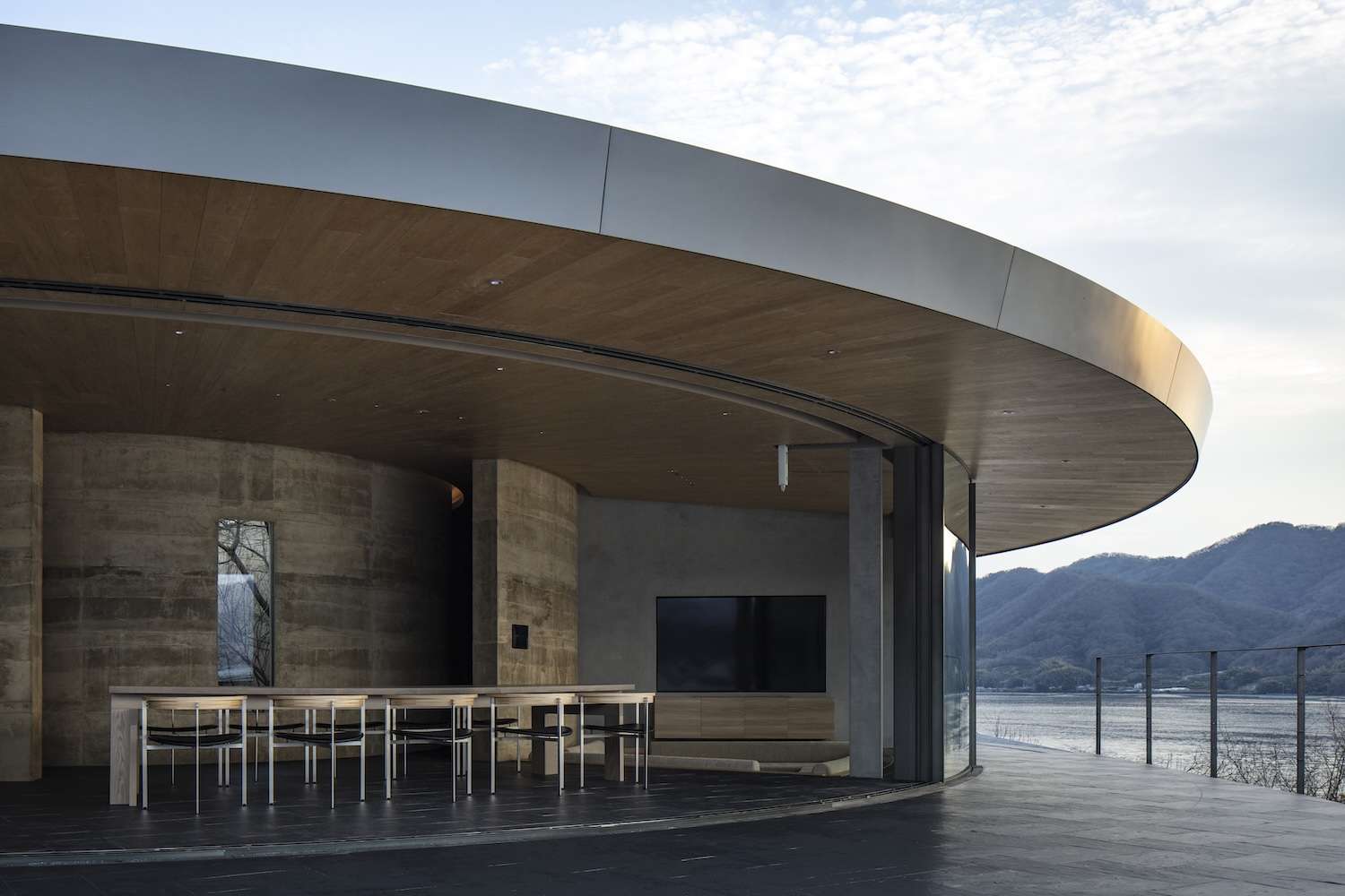 Curved rammed earth walls, built with local aggregate, carry the striated warmth of the region’s geology into the interiors. Think of rammed earth as a geological core sample turned vertical – each compressed layer records the color and mineral content of the ground it came from. The technique connects the project to a lineage running from traditional Japanese dobe plastering through Martin Rauch’s contemporary rammed earth innovations in Austria. Glass facades serve as contemporary translations of shoji screens, dissolving the boundary between interior space and the sea while floor layouts reference the proportional logic of tatami mat arrangements. These are not decorative gestures. They establish a tectonic dialogue where Scandinavian openness meets Japanese spatial modulation.