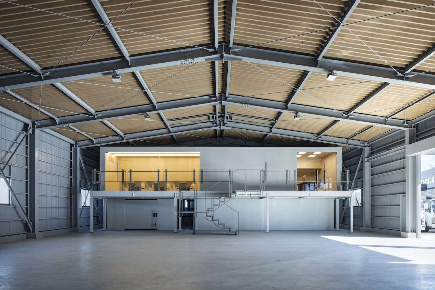 Glass-enclosed volumes on the second floor house the president’s office and meeting room, maintaining visual connectivity throughout the space. Wood-finished walls and ceilings within these enclosures introduce warmth against the factory’s prevailing grey palette – a material contrast that operates through temperature rather than color, much the way Hiroshi Nakamura’s interiors use timber to humanize utilitarian shells. The effect draws attention upward, with distinctive tables and shelving acting as visual anchors that pull visitors toward the second floor.