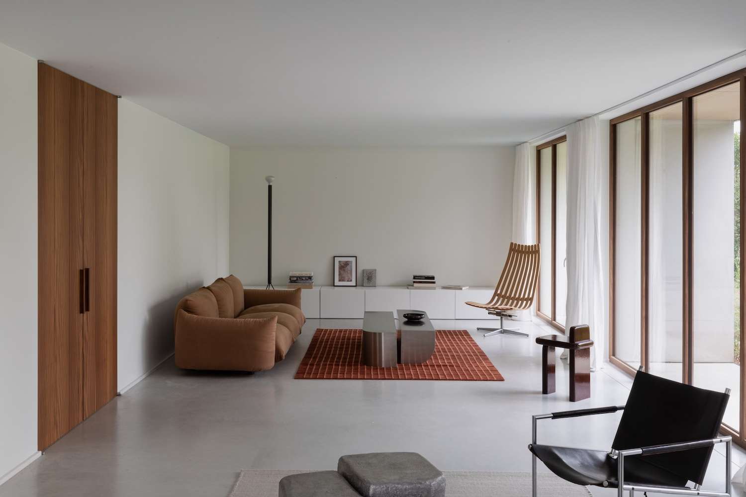 Rough facade finish combined with monolithic flooring establishes material restraint punctuated by warm afrormosia wood accents flowing seamlessly from exterior into interior. These wooden elements receive flanking by subtle natural stone and brass details that introduce tactile and visual variety without overwhelming the material palette’s essential simplicity. The afrormosia selection provides durable tropical hardwood appropriate for both exterior weathering and interior finish applications.