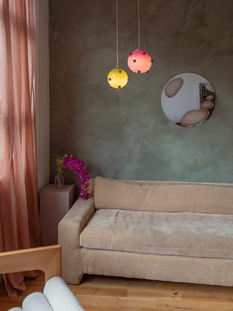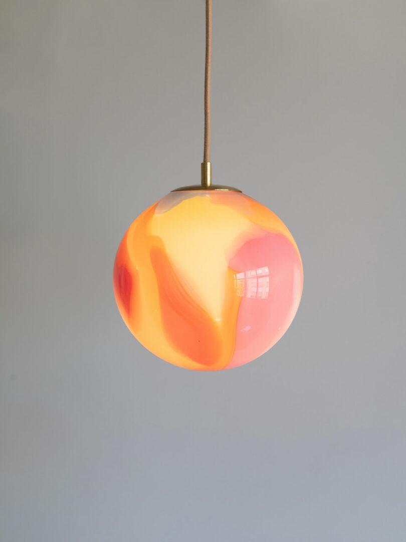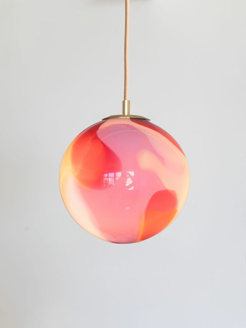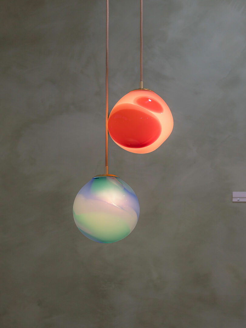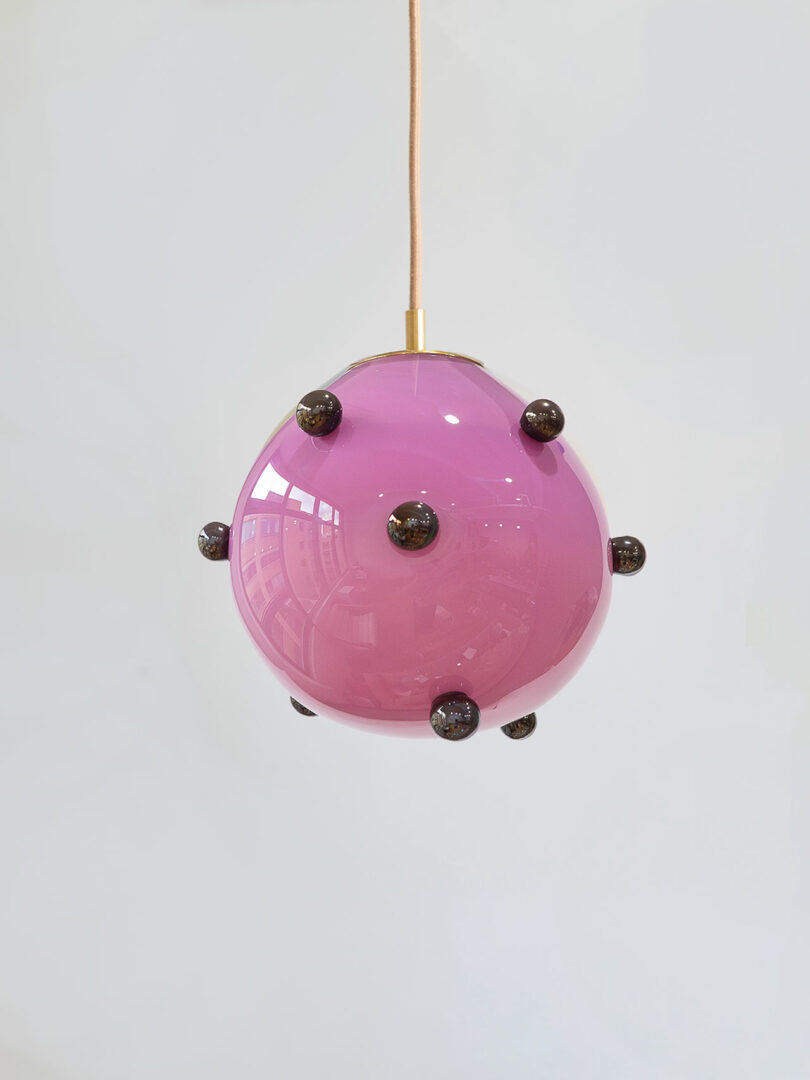 Some objects have an indescribable magnetism, something that sparks neurons deep within the brain. Call it what you like, style, substance, ‘it’, you know it when you see it. Brooklyn-based Courtney Kinnare taps in to this vein of creativity with her newest releases, the Berry Polka Pendants and her Sorbetto lighting series, now available at Tuleste Factory. Working in glass, resin, and jewelry, the vertices of transparency, reflection and layering are essential to her work.
