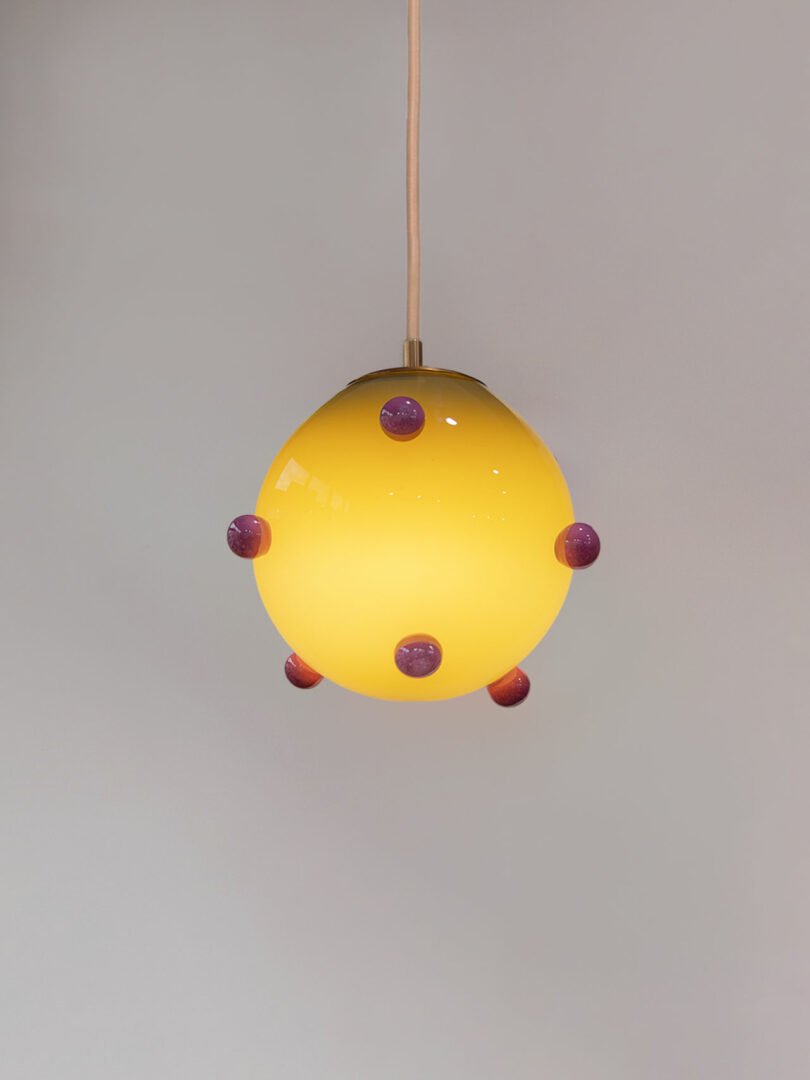The Olive Polka Pendant, olive with purple dots, are fused and inset just slightly into the main body of the lamp, resting gently on the surface, virtually weightless. The Berry Polka Pendant, purple with olive dots, is not it’s pair’s opposite, but a sister, or maybe a cousin. A warm glow exudes from the orbs, held in stately brass hardware, suspended in space. Powerful when hung in tandem, they bring balance either right next to each other, or separately, adding to the use cases where we could imagine these pieces.
