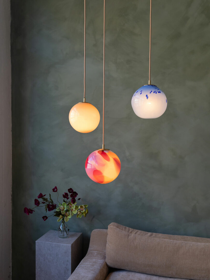 These brilliant blues and aquas create a beautiful balance between warm and cool, a tactile yet ethereal quality tied to the work. As each piece is handmade, there will be welcome change within the globes, each a product of the unique expertise that brings this lighting to life.