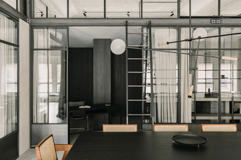 Black mullions and corresponding kick plates fix tall glazed panels and doors to the floor. Each length is lined with floor-length, light, cotton-linen panels that can be drawn closed from inside the bedrooms at each resident’s discretion. And black stained wood is juxtaposed with white gypsum wall finishes as a direct reference to Colmar’s coal industry.