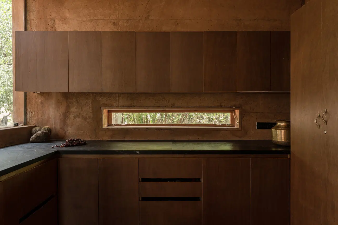 “A home in a vulnerable ecosystem had to be a breathing edifice, born of the earth, slowly ebbing into the soil,” write the architects. “A living home for living beings. With reference to the indigenous construction practices of mud architecture and courtyard houses, our design approach was grounded in history and equally modern for the city dwellers to adapt. The shell had to allow the gaze to penetrate the surfaces, bear witness of age and history on its skin and withhold the openness of the client in its layout.”